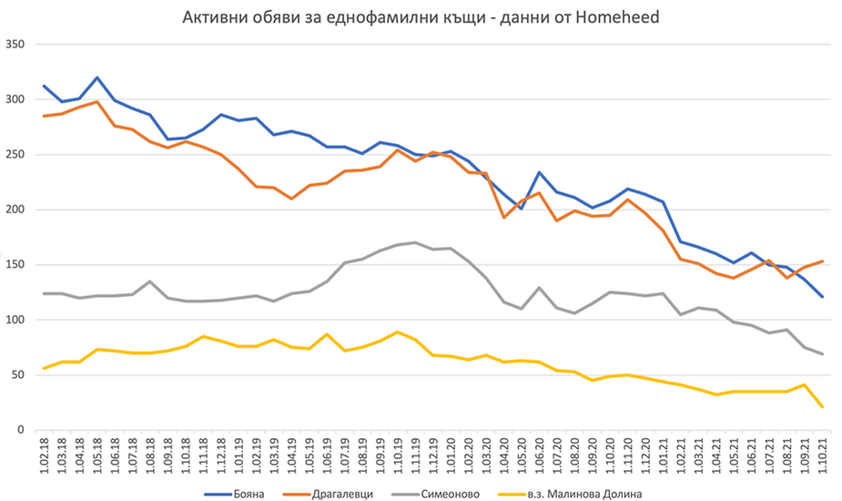 Предлагането на еднофамилни къщи в полите на Витоша пък бележи рекордно ниски нива. По данни на Homeheed, броят активни обяви за продажба на къщи в Бояна и Драгалевци варира между 220 и 330 от 2018г до второто тримесечие на 2020 година, след което започва по-ускорен спад. През последните месеци на 2021г. предложенията са вече под 150 и продължават да намаляват. Ситуацията е сходна и в Симеоново и в.з. Малинова Долина, като и в двата квартала най-голямо предлагане е имало през октомври 2019г., а най-малко – точно две години по-късно.